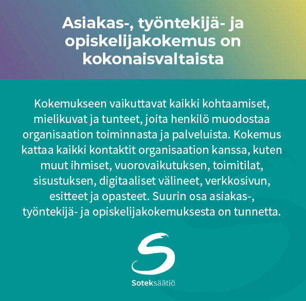 Sotek-säätiön laatutavoitteet ovat: Erinomainen asiakaskokemus, NPS vähintään 30, ja erinomainen työntekijäkokemus, eNPS vähintään 30. Tavoitteiden saavuttamista seurataan säännöllisillä kyselyillä. Myös opiskelijakokemusta seurataan omalla, opiskelijoille ja heidän harjoittelunsa ohjaajille osoitetulla kyselyllään. Tässä jutussa käymme läpi syksyllä 2025 toteutettujen asiakas-, työntekijä- ja opiskelijakokemuskyselyiden tuloksia.
