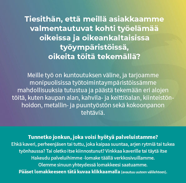 - ”Työtoiminta ja tehtävät ovat olleet minulle sopivia oman hyvän henkisen hyvinvointini tueksi sekä koen ilmapiirin lämpimäksi. työtehtävät ovat olleet sopivia monin tavoin eivätkä ole kuormittaneet minua liikaa omien haasteideni suhteen.”